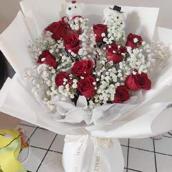 保定近日实拍:11朵红玫瑰,2个小熊,粉色满天星、白色满天星丰满;白色雾面纸包装,红色丝带束扎;