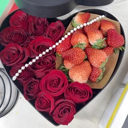 长春近日实拍:13朵红玫瑰,16颗草莓,满天星点缀,项链装饰;心形礼盒(颜色以实物为准);