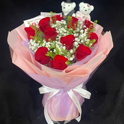 成都近日实拍:19朵红玫瑰,2支粉色多头百合,红豆、尤加利搭配;红色欧亚纸扇形包装,白色内衬,红色丝带束扎;