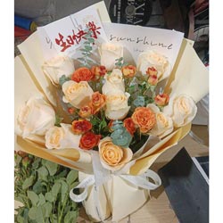成都近日实拍:11朵香槟玫瑰,多头玫瑰、尤加利搭配;香槟色欧亚纸单面包装,香槟色丝带束扎,白色内衬;
