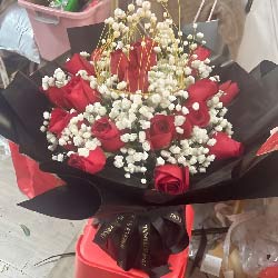 滁州近日实拍:19朵红玫瑰,满天星丰满,皇冠一个(样式以实物为准);黑色尖角包装,黑纱包裹,黑纱丝带束扎;