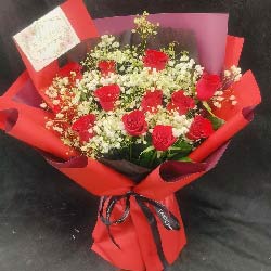 东莞近日实拍:12朵红玫瑰,周围满天星搭配;红色雾面纸单面包装,黑色内衬,黑色丝带束扎;