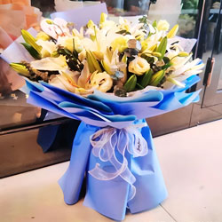 大连近日实拍:9支白色多头百合,桔梗、尤加利搭配;蓝色欧亚纸扇形包装,浅色丝带束扎;