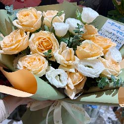 东营近日实拍:11朵香槟玫瑰,6朵绿色桔梗,尤加利搭配;深青色欧亚纸单面包装,浅色丝带束扎;