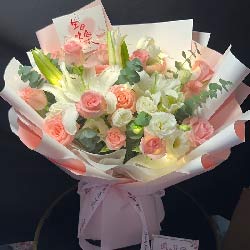:16朵戴安娜粉玫瑰,2支白色多头百合,灯带一条,桔梗、尤加利搭配;粉色欧亚纸扇形包装,粉色丝带束扎;