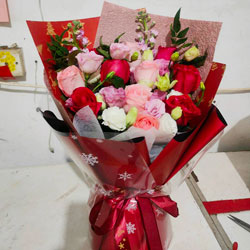 佛山近日实拍:9朵玫瑰混搭(5朵红玫瑰,4朵戴安娜粉玫瑰),2支紫罗兰,粉色桔梗搭配,配叶搭配;红色纯色欧亚纸扇形包装,粉色压纹纸内衬,红色丝带束扎;