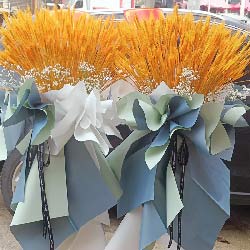 阜阳近日实拍:麦穗大麦干花一大把(不少于360支),满天星周围搭配;蓝色白色雾面纸包装,三脚架开业花篮,黑色丝带;