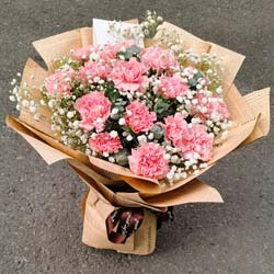 :18朵粉色康乃馨,满天星、黄英点缀;英文报纸圆形包装,灰色丝带束扎;