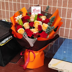 韶关近日实拍:18朵玫瑰混搭(9朵红玫瑰,9朵香槟玫瑰),9朵红色康乃馨,1支白色多头百合,绿玲草、尤加利搭配;咖啡色欧亚纸扇形包装,红色丝带束扎;
