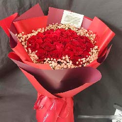 荷泽近日实拍:33朵红玫瑰,周围相思梅搭配;酒红色欧亚纸包装,红色丝带束扎;