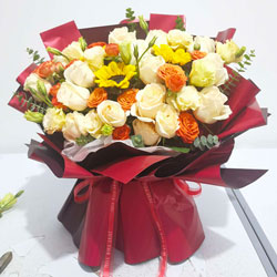 荷泽近日实拍:11朵香槟玫瑰,5朵黄金海岸玫瑰,3朵向日葵,多头玫瑰、尤加利、桔梗搭配;绿色欧亚纸扇形包装,白色内衬,白色丝带束扎;