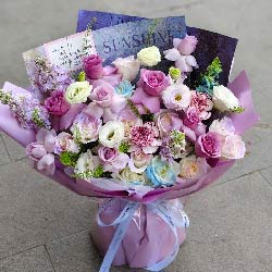 :19朵紫玫瑰,4支白色紫罗兰,11朵桔梗,黄英搭配;紫色欧亚纸扇形包装,紫色丝带束扎;