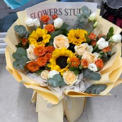 吉林近日实拍:6朵香槟玫瑰,3朵向日葵,5支桔梗,多头玫瑰、蓝心花搭配;香槟色欧亚纸扇形包装,白色内衬,白色丝带束扎;
