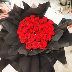 :33朵红玫瑰,1支蝴蝶兰;黑色尖角包装,红色丝带束扎;