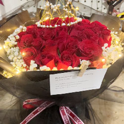 :33朵红玫瑰,周围满天星丰满,皇冠一个;黑色圆形包装,黑色细纱包裹,红色丝带束扎;