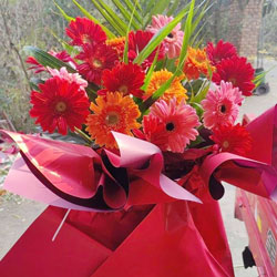 绵阳近日实拍:26朵各色扶郎花,散尾葵、配叶搭配;红色欧亚纸包装,三脚架开业花篮;