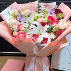 绵阳近日实拍:9朵艾莎粉玫瑰,2支白色多头百合,2支紫罗兰,折射多头玫瑰、粉紫渐变多头康乃馨、桔梗(喷粉色)、配叶搭配;粉色欧亚纸扇形包装,白色丝带+项链丝带束扎;