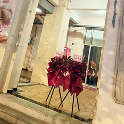南通近日实拍:29朵红玫瑰,红色扶郎花、红豆、配叶搭配;红色欧亚纸包装,红色丝带束扎,三脚架开业花篮;