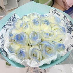 黔南州近日实拍:18朵碎冰蓝白玫瑰;蓝色压纹纸圆形包装,蓝色花纹纸包装,珠光纸内衬,蓝色丝带束扎;