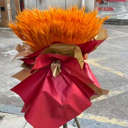 衢州近日实拍:一大扎大麦花束(不少于450支);酒红色欧亚纸包装,三脚架开业花篮,红色丝带;