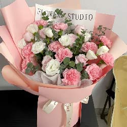 :6朵戴安娜粉玫瑰,11朵粉色康乃馨,11朵桔梗,尤加利搭配;粉色欧亚纸扇形包装,浅色丝带束扎,白色内衬;