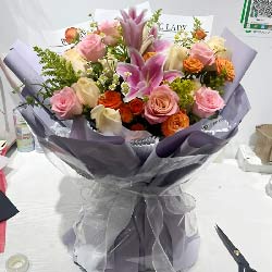 遂宁近日实拍:16朵玫瑰混搭(10朵香槟玫瑰,6朵戴安娜粉玫瑰),1支多头百合,4支多头玫瑰、洋甘菊、尤加利、栀子叶搭配;紫色雾面纸扇形包装,咖啡色丝带束扎;