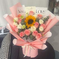 商丘近日实拍:12朵戴安娜粉玫瑰,1朵向日葵,项链装饰,桔梗、尤加利搭配;粉色欧亚纸扇形包装,白色内衬,白色丝带束扎;