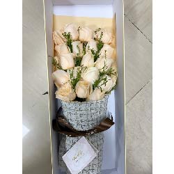 汕尾近日实拍:19朵香槟玫瑰,黄英搭配;咖啡色麻片包装,咖啡色丝带束扎,长方形礼盒(颜色以实物为准);