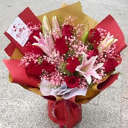 十堰近日实拍:11朵红玫瑰,2支粉色多头百合,黄英、粉色满天星搭配;红色黄色欧亚纸单面包装,红色丝带束扎;