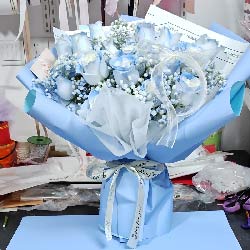 苏州近日实拍:22朵碎冰蓝白玫瑰,蓝色满天星丰满,花结一个;蓝色欧亚纸扇形包装,浅色蓝色丝带束扎;
