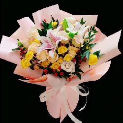 济南近日实拍:11朵香槟玫瑰,1支粉色多头百合,红豆、桔梗、栀子页搭配;红豆粉色欧亚纸包装,浅色丝带束扎;