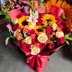 :19朵红玫瑰,8朵香槟玫瑰,1支粉色多头百合,3朵向日葵,尤加利、红豆、多头玫瑰搭配;红色欧亚纸扇形包装,红色丝带束扎,白色内衬;