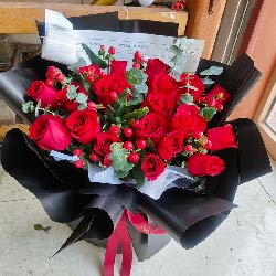 潍坊近日实拍:19朵红玫瑰,红豆、尤加利搭配;黑色纯色欧亚纸扇形包装,黑色内衬,红色黑色丝带束扎;