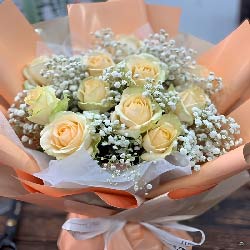 芜湖近日实拍:11朵香槟玫瑰,满天星、尤加利搭配;香槟色欧亚纸扇形包装,香槟色丝带束扎,白色内衬;