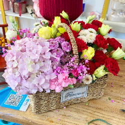 温州近日实拍:16朵红色康乃馨,8朵桔梗,2只粉色绣球花,相思梅、配叶搭配;精致小花篮(样式以实物为准);