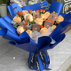文山州近日实拍:12朵香槟玫瑰,5支橙色多头玫瑰,尤加利搭配,10包香烟(图片为模型示例);深蓝色平面纸扇形包装,深色丝带束扎;