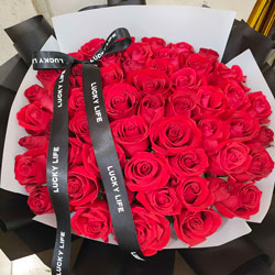 武汉近日实拍:52朵红玫瑰,黑色丝带花结;黑色平面纸包装,白色内衬,黑色丝带束扎;