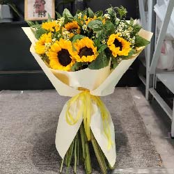 :12朵向日葵,小雏菊、配叶搭配;香槟色雾面纸包装,手捧花,黄色丝带束扎;
