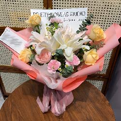 :5朵玫瑰(4朵香槟玫瑰,1朵戴安娜粉玫瑰),4朵粉色康乃馨,1支白色多头百合,洋甘菊、尤加利搭配;粉色欧亚纸扇形包装,粉色丝带束扎;