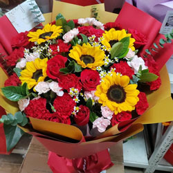 烟台近日实拍:11朵红玫瑰,11朵红色康乃馨,6支粉色多头康乃馨,5朵向日葵,洋甘菊、尤加利搭配;红色金色欧亚纸包装,红色丝带束扎;