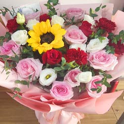 :9朵玫瑰(6朵戴安娜粉玫瑰,3朵红玫瑰),3朵红色康乃馨,1朵向日葵,配叶、桔梗搭配;粉色欧亚纸扇形包装,浅色丝带束扎,白色内衬;