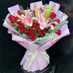 重庆近日实拍:19朵红玫瑰,2支粉色多头百合,尤加利搭配;紫粉色欧亚纸单面包装,紫色丝带束扎;