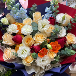 重庆近日实拍:16朵玫瑰混搭(12朵黄金海岸黄玫瑰,4朵红玫瑰),2支紫罗兰(碎冰蓝),桔梗、多头玫瑰、红豆、尤加利搭配;蓝色+红色欧亚纸扇形包装,咖啡色丝带束扎;