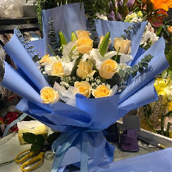 上海近日实拍:11朵香槟玫瑰,2支白色多头百合,尤加利、满天星、桔梗搭配;浅蓝色雾面纸扇形包装,蓝色丝带束扎;