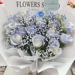 :18朵碎冰蓝白玫瑰,蓝色满天星丰满;白色雾面纸扇形包装,白色英文纸内衬,白色丝带束扎;