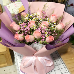 天津近日实拍:11朵戴安娜粉玫瑰,粉色满天星丰满,灯带搭配,洋甘菊、尤加利搭配;紫色粉色欧亚纸扇形包装,浅色丝带束扎;
