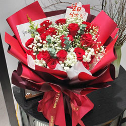 天津近日实拍:17朵红玫瑰,满天星、黄英、尤加利搭配;酒红色欧亚纸单面扇形包装,红色丝带束扎;